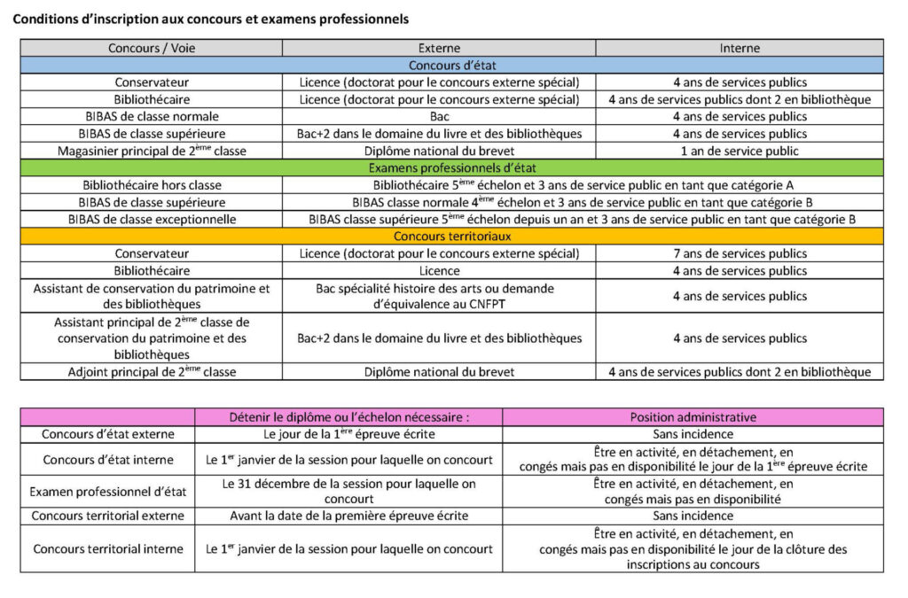 - dans la fonction publique d’État : bibliothèque universitaire, bibliothèques de grandes écoles, Bibliothèque nationale de France, Bibliothèque publique d’information, Bibliothèque nationale et universitaire de Strasbourg.