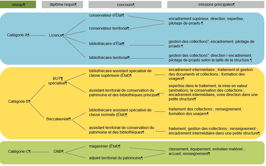 Les concours et les emplois qui y correspondent sont répartis en 3 catégories, qui seront plus ou moins représentées selon l’importance de la bibliothèque : plus la bibliothèque est petite, moins il y a de personnels de catégorie A (il n’y en a parfois pas du tout).